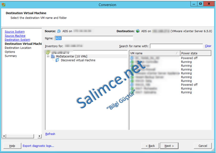 Destination Virtual Machine ekranında vCenter altındaki tüm sanal makinelerin listesi görünmekte, Next ile devam ediyoruz.