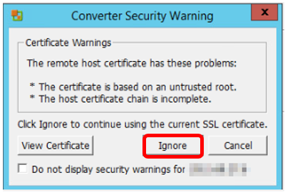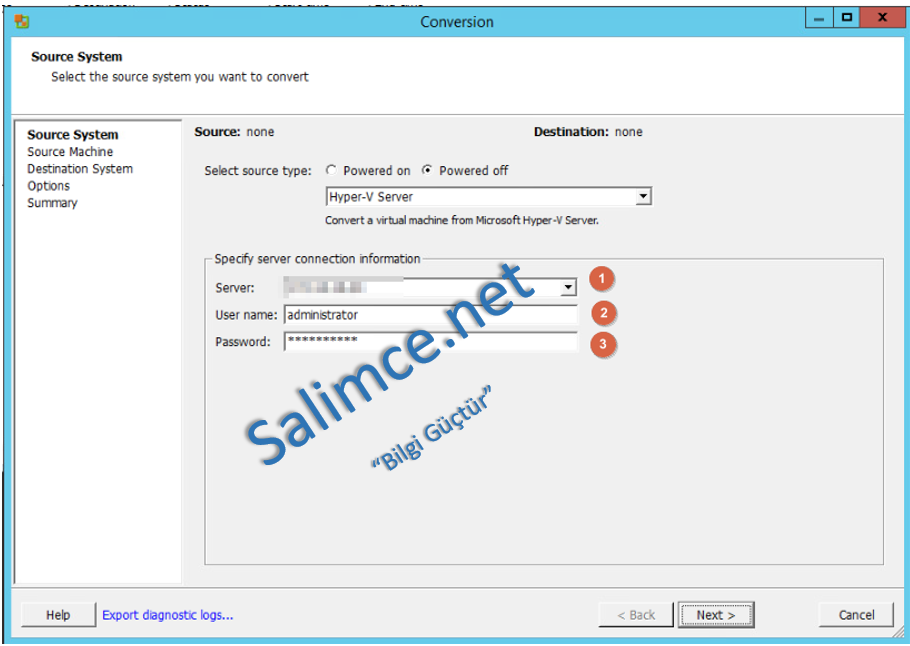 Source System ekranında Hyper-V hostumuzun ip adresini, kullanıcı adı ve şifre bilgilerini girerek Next e tıklıyoruz ve çıkan uyarıya Ignore diyerek devam ediyoruz