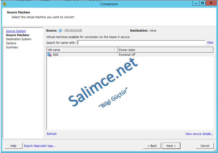 Source Machine ekranında convert edeceğimiz sunucuların listesi görülüyor. Benim Hyper-V hostumda bir tane sanal makine var.