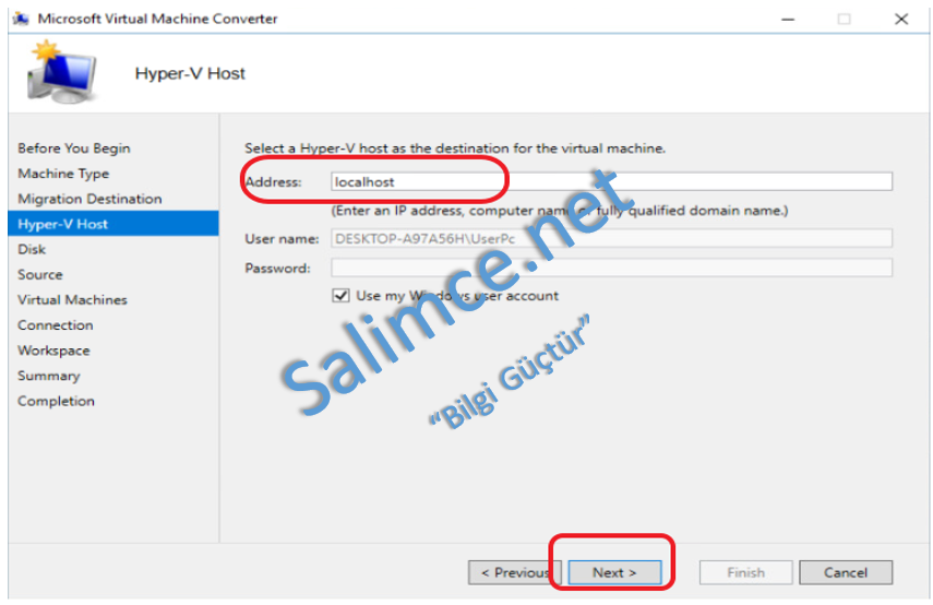 Migration Destination ekranında Sanal Makinemizi Hyper-V ortamına taşıyacağımız için Migrate to Hyper-V seçeneği le devam ediyoruz