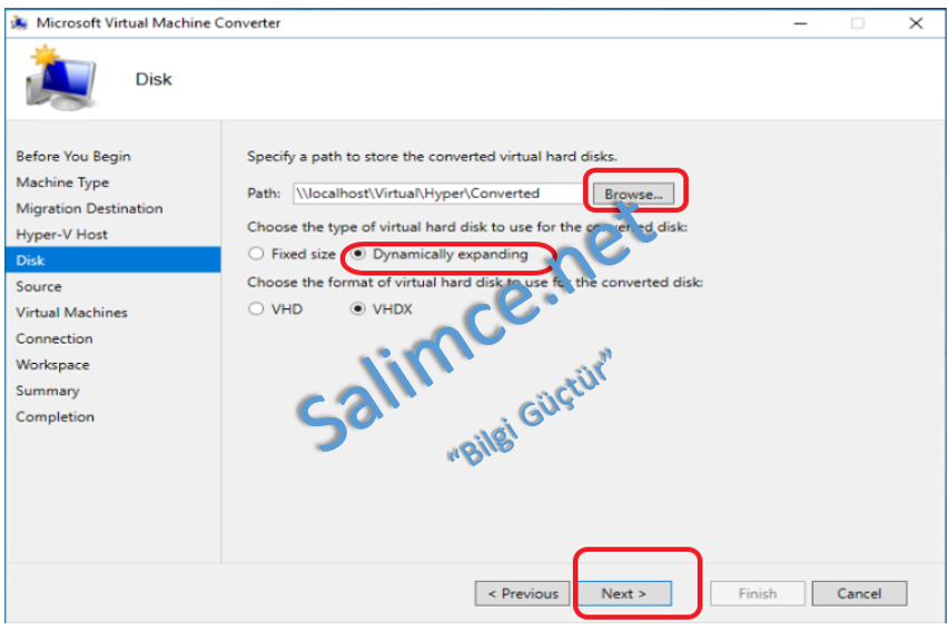 Disk ekranına geldiğimizde VMWare den dönüştüreceğimiz sunucunun Disk tipi ve disk formatını seçip Nereye convert edileceğini belirliyoruz.