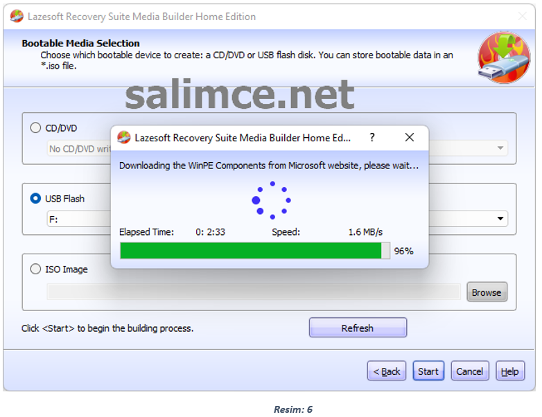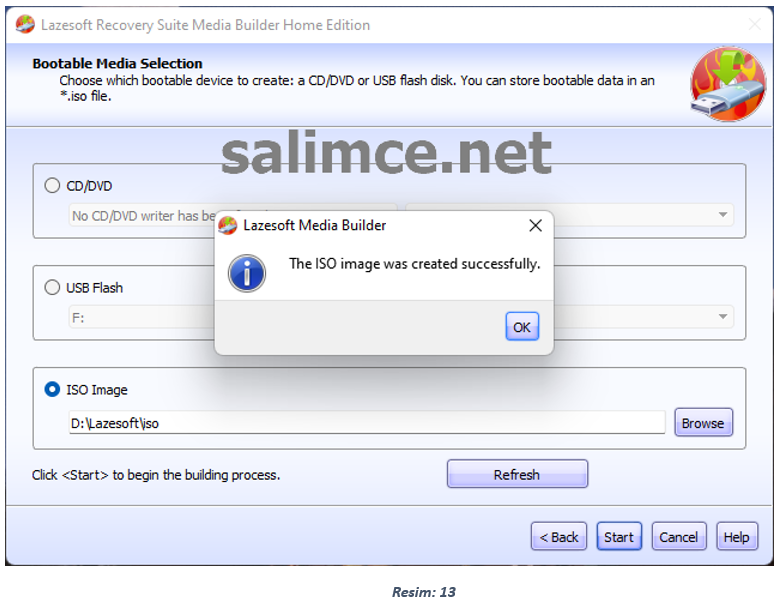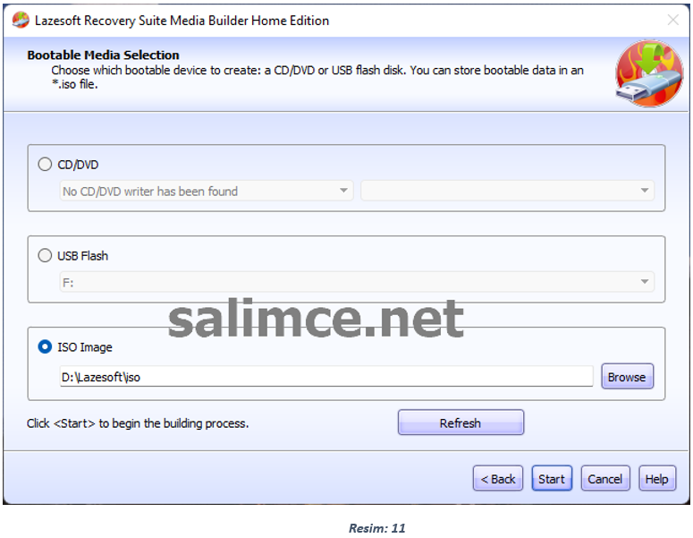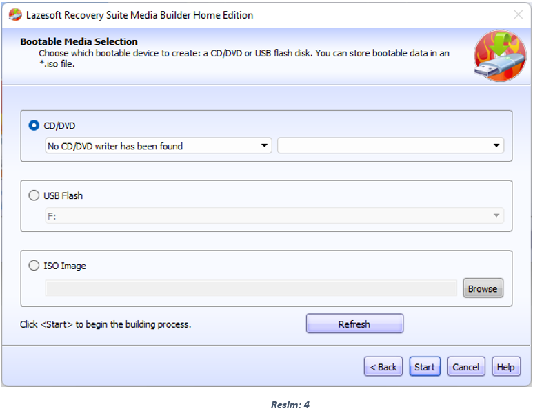 Sonraki (Bootable Media Selection) ekranında CD/DVD seçeneğini seçerek Dvd-Rw Sürücümüze yazılabilen boş bir cd / dvd taktıktan sonra Start diyerek işlemimizi başlatıyoruz ve Yazma işlemi bittiğinde Boot Cd miz hazır hale geliyor. Sistemi artık Bu Cd ile başlatabilirsiniz.