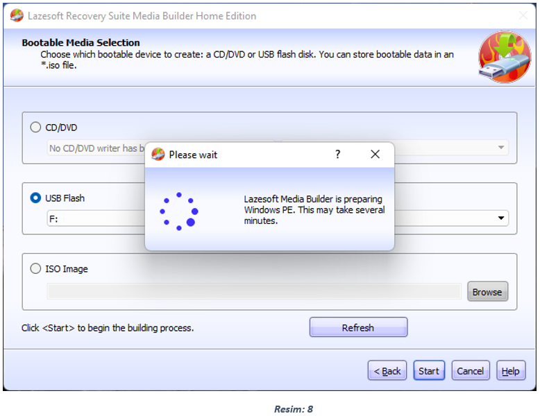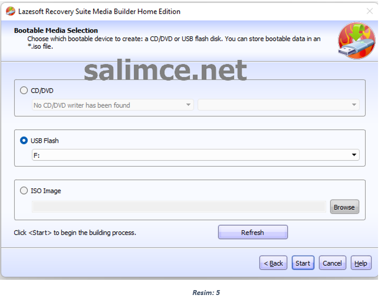 Resim 1, Resim 2 ve Resim 3 teki adımları aynı şekilde uyguluyoruz. Bilgisayarımıza USB Bellek takılı iken Açılan ekranda (Bootable Media Selection) Usb Flash seçeneğini seçiyor ve Start ile devam ediyoruz