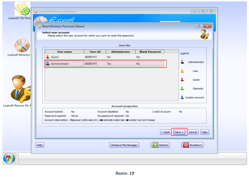 Parolasını resetlemek istediğim Kullanıcının üzerine gelerek (Biz Administrator hesabını resetleyeceğiz) seçiyor ve “Next” e tıklıyoruz.