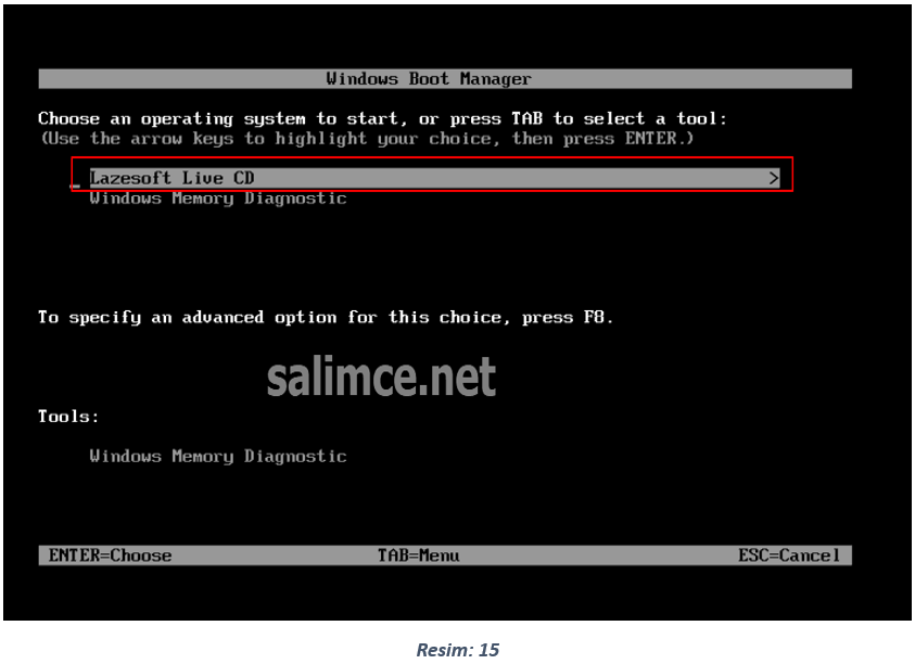 Bilgisayarı Usb bellek üzerinden boot ederek açtığımızda karşımıza aşağıdaki resimde görünen siyah ekran gelecek. Burada “Lazesoft Live CD” seçeneğini seçerek Enter tuşuna basıyoruz.