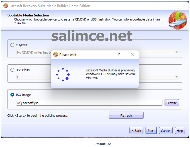 Resim 1, Resim 2 ve Resim 3 teki adımları aynı şekilde uyguluyoruz. Bootable Media Selection ekranında ISO Image seçeneğini seçiyor ve ISO İmajın oluşturulacağı klasör yolunu belirleyerek devam ediyoruz.