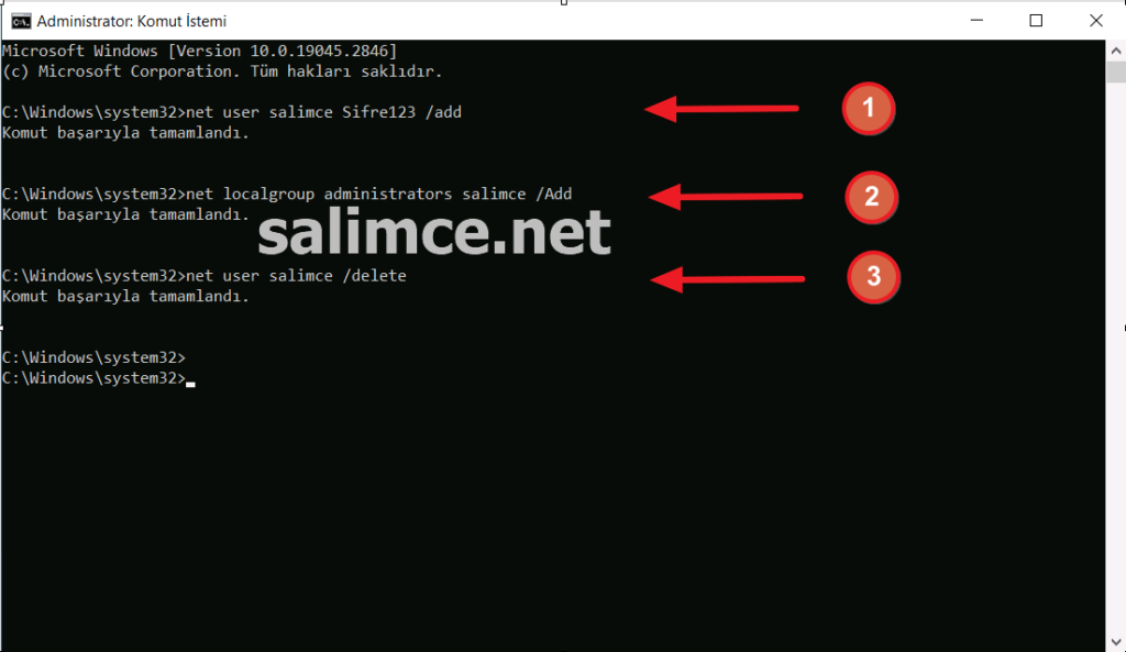 3. Üçüncü komut ile standart veya yönetici olsun bir kullanıcı hesabını silebiliyoruz.